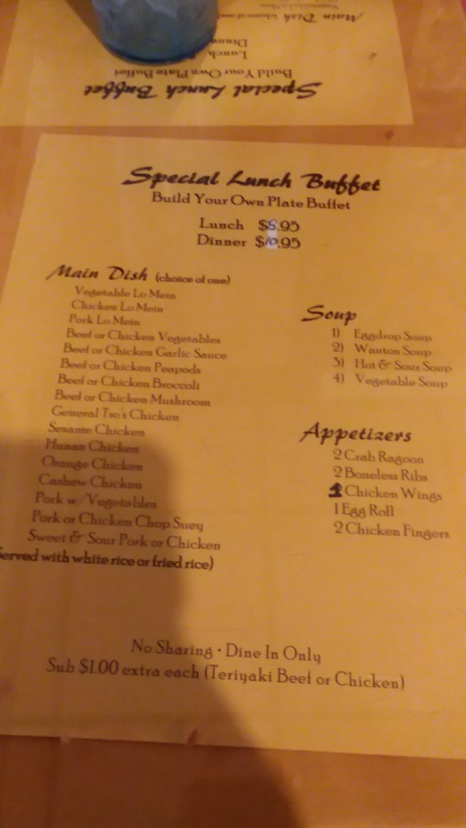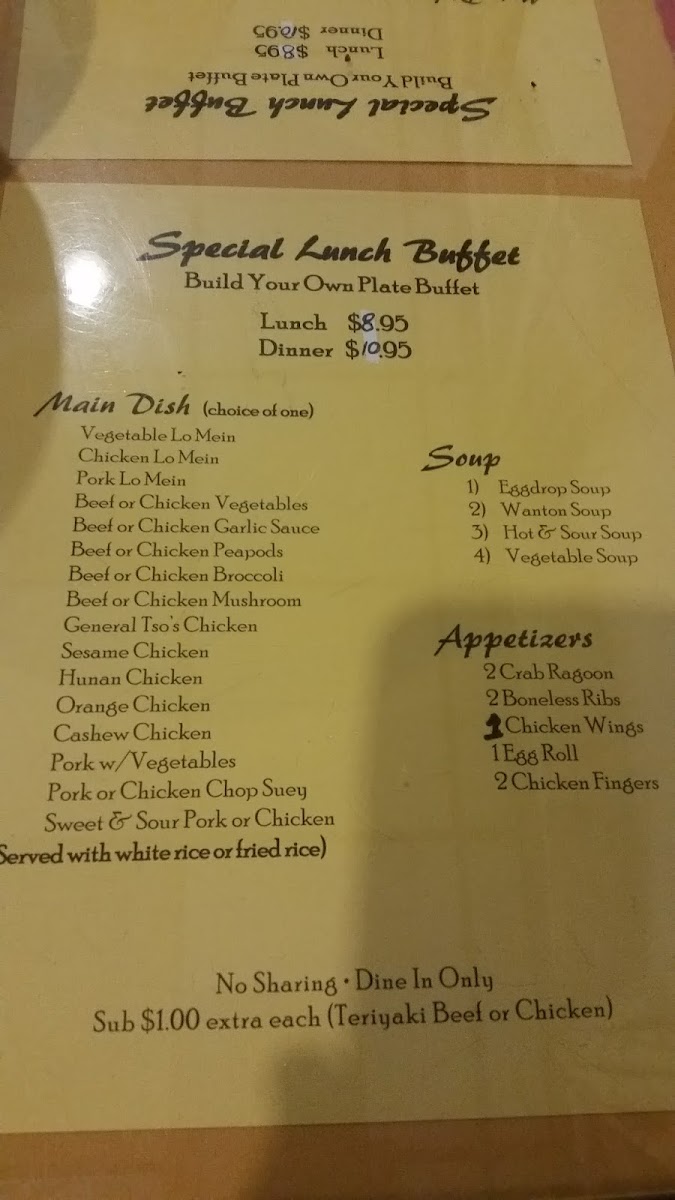 Boneless ribs, teriyaki chicken, beef, egg rolls, chicken fingers, shrimp, chicken wings.